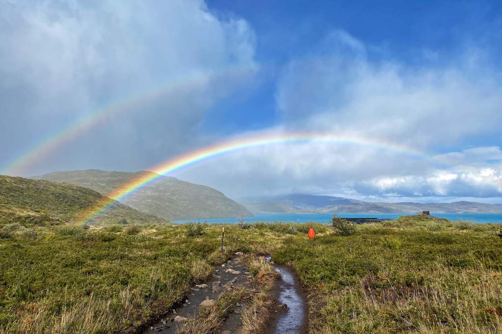 We zoeken dan maar een plaats met wat meer beschutting om die crackers naar binnen te spelen. Voortgeduwd door de wind en gelokt door een prachtige dubbele regenboog bereiken we vlot Paine Grande.