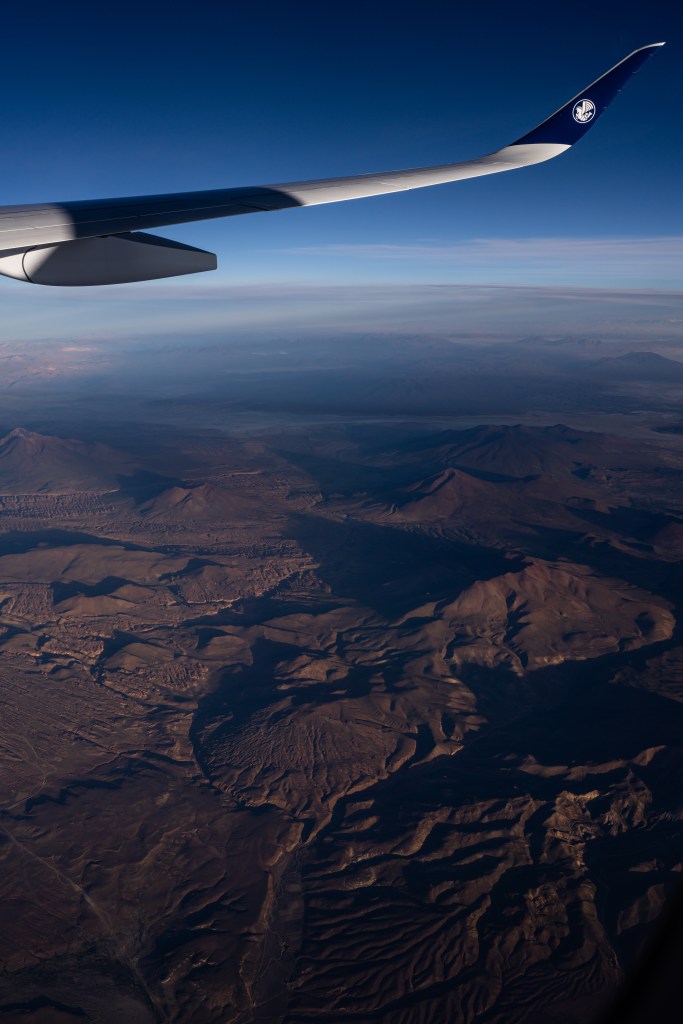Vanuit het raam zie ik de schaduw en het vliegtuig zelf samenkomen bij een perfecte landing. We zijn in Santiago, Chili! Het is er zo’n 30 graden!